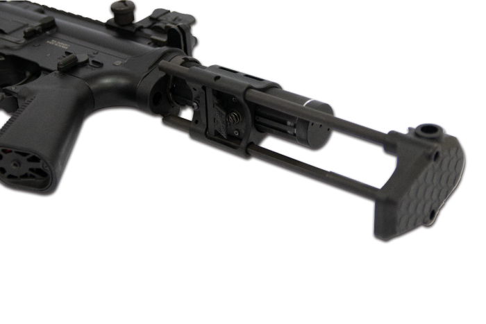 B.R.S.S. system simulates the recoil force of a real rifle by transferring the kinetic energy from piston to the reciprocating weight hammer inside the stock using a high efficient energy transferring mechanism.