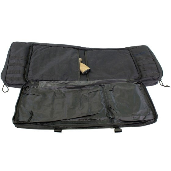 The main compartment is padded in every direction to protect your valuable rifle. This includes outer wall padding, padding around the zip line and base, padded corner slips to hold the rifle, as well as a padded divider so you can store two rifles at once! Two Velcro straps are within the walls as well to hold the rifles to the walls of the bag.