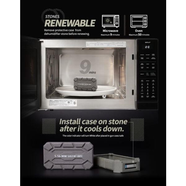 SILENT DRY Dehumidifier stones can be renewed by either microwave or oven to achieve reusable functionality. Based on testing and measurement results, it can be renewed at least one hundred times.