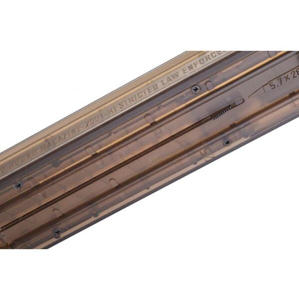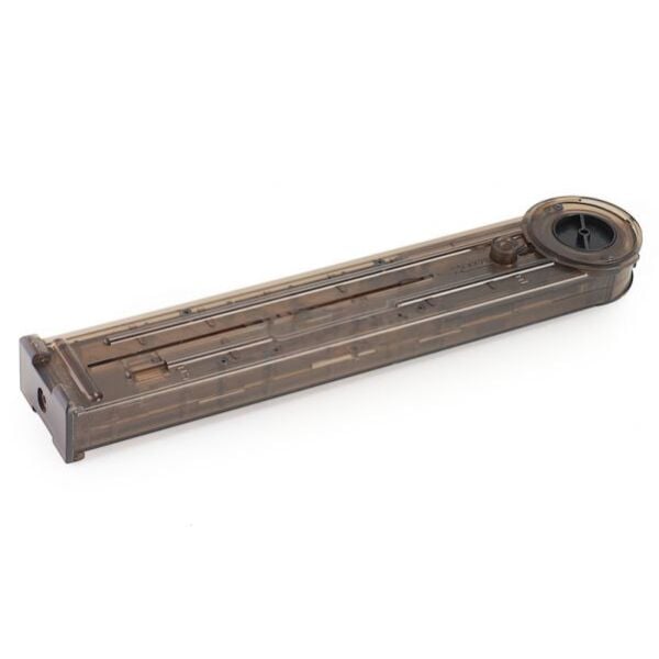 A high capacity replacement of the standard magazine for the Marui P90 and P90TR rifle. Large twist dial on bottom of magazine allows you to wind it up and feed 300 rounds of BBs into your AEG. Full metal construction.