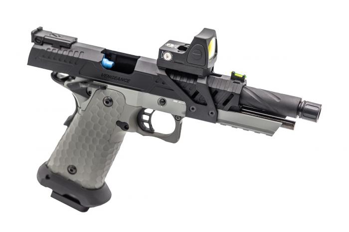 When compared to VORKSs standard 5.1 Hi-Capas, the CS VENGEANCE features a new adjustable rear iron-sight, an extended magazine base plate and the inclusion of a floating BDS option. The slide markings are a new pattern with some forward cut-outs revealing the fluted outer barrel within. A common feature of our Hi-Capas is the inclusion of a Flash-Hider, that expertly covers a 12 mm (CW) to 14 mm (CCW) thread adaptor, making VORSK Hi-Capas “attachment ready”, especially with the real-estate provided by the Picatinny under barrel.