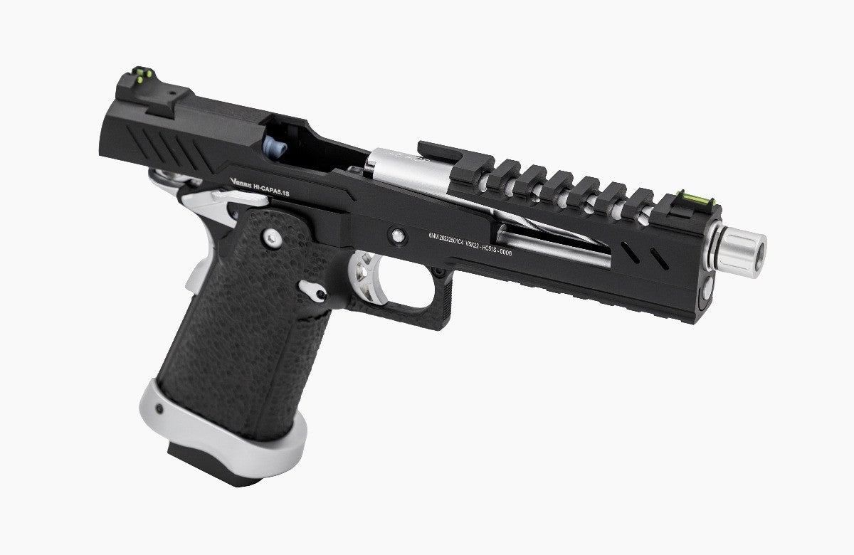 | Included | (x1) VORSK Hi-Capa 5.1 (x1) STD Gas Magazine Black - VGM-02-01 (x1) 12 mm to 14 mm Thread Adaptor FLASH HIDER (x1) Barrel Bushing Tool (x1) Spare Gas Nozzle (x1) CO2 Nozzle (x1) Manual (x1) Exploded Parts Diagram (x1) VORSK PVC Patch |