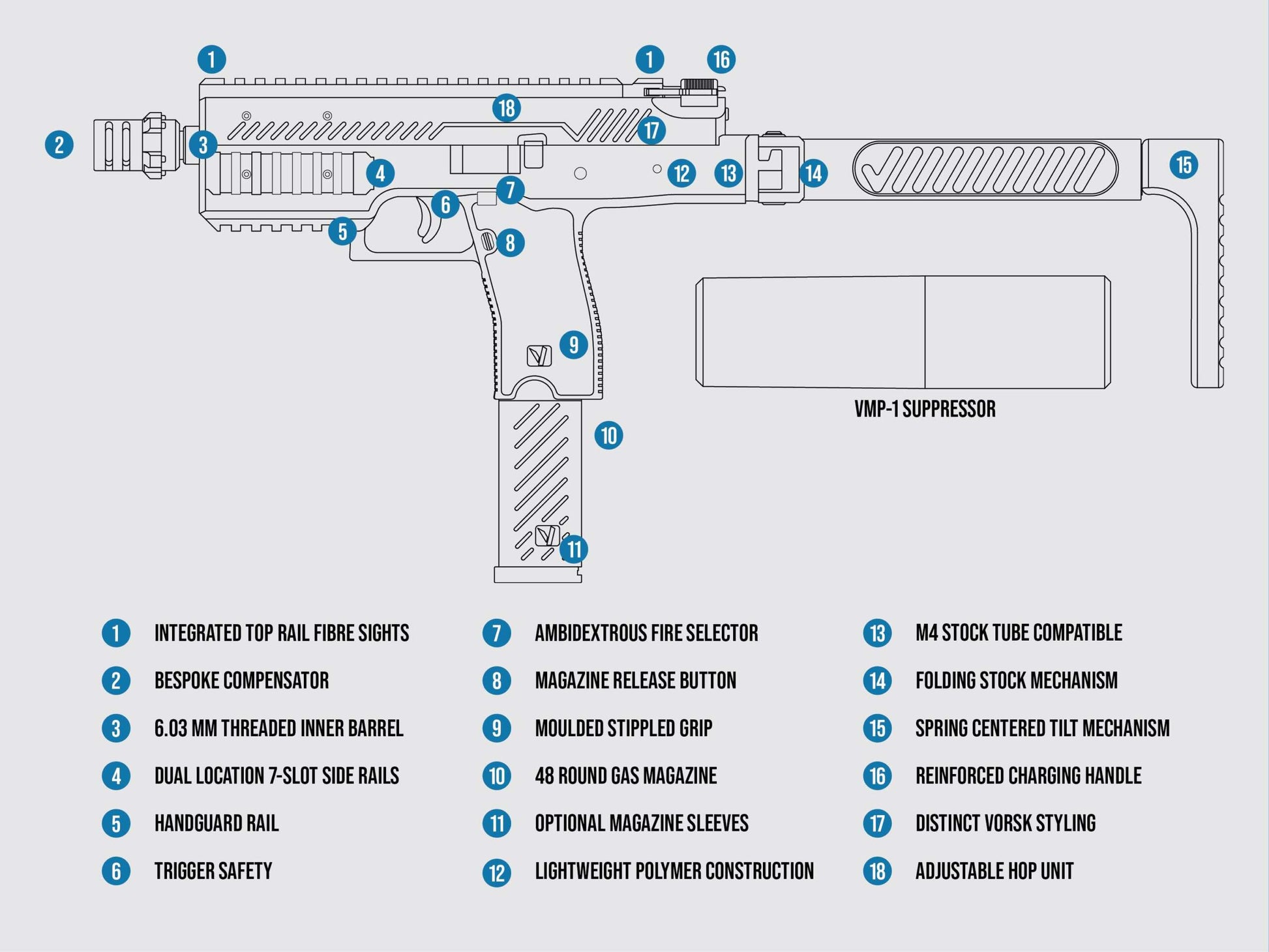 The VMP-1 is VORSK's first gas blowback submachine guns. It is a lot of gun for its money and is very affordable. The VMP-1 is in the style of the MP9 platform but with a new style, complete with a side folding stock/brace setup and a unique QD suppressor and mounting system built into the muzzle itself.