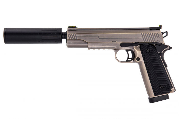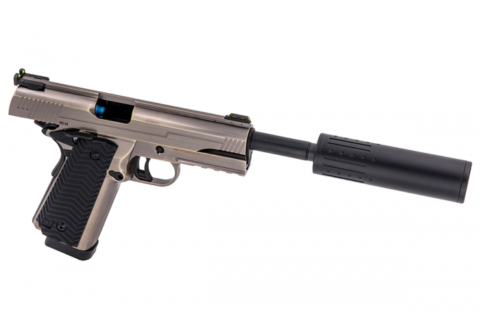 The VX-14 is a GBB Airsoft Pistol that brings together features usually found on Hi-Capa and 1911/MEU airsoft replicas. Using the double stacked powerhouse that is the Hi-Capa magazine you can be assured of the performance of this airsoft replica as it delivers BBs downrange with an incredibly satisfying recoil experience. The half length rail and curved trigger guard taken from 1911/MEU models ensures 1911 holster compatibility whilst also delivering a slightly more ‘traditional’ look when compared to the more audacious Hi-Capa series. The slide features green fibre sights, tied together front and rear by the integrated slide ridge rail that was first seen on the VX-9 AGENCY from VORSK. This ridge rail adds some noticeable weight to the slide and is a very satisfying experience when bouncing off of the return spring during engagements. It also boosts the side-profile of the pistol giving it a very bulky look when compared to standard 1911/MEU models. Another borrowed feature from the AGENCY is the inclusion of the 6.03mm Tightbore Barrel Extending Suppressor Kit that will help deliver a small boost in FPS and Range, great for the target range and completing the look of this imposing sidearm. The pistol grip is injection moulded plastic, providing a suitably sturdy yet noticeably chunky grip due to the double stacked magazine within. The grip features a wave-“v” pattern which is also found on the Mag-Release button, another nice touch.